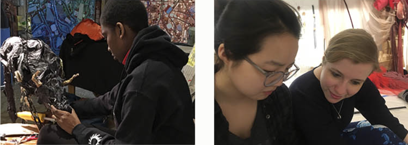 The development process includes: reading, discussing, making objects, experimenting with movement, and curating those components into visual poetry. We worked with seasoned White Box studio-makers and new volunteers. For the first part of the project, we were in-residence with Philadelphia mosaicist, sculptor, and painter, Isaiah Zagar in his tremendous South Philadelphia studio. We also spent two days in-residence at Delaware State University experimenting with building and performance techniques with 11 students in Heather Ossandon’s Sculpture class.